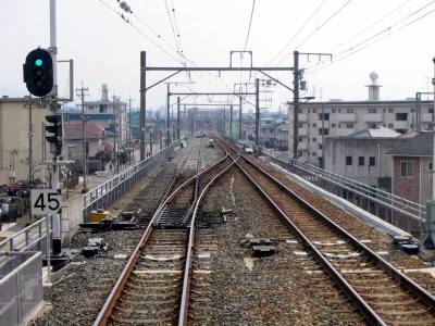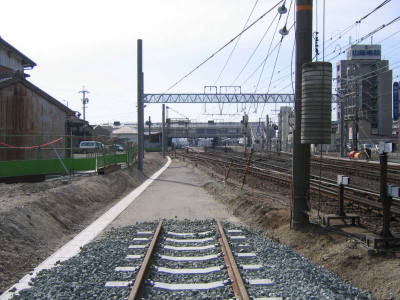 | 愛知環状鉄道は現在岡崎駅から約370メートルをJR東海道線上りと共用しています。同区間はJR優先のためダイヤに制約が生じていることからこれを分離するため別線新設工事が行われています。 新しい線路は六名駅から分岐し、JR東海道線上り線との交差部から東海道線の東側に沿って敷設されます。 工事は2002年6月に開始され、2004年12月の完成予定です。 |